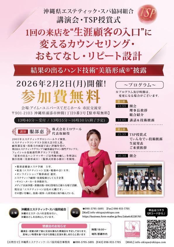 TSP資格の取得者には技術、文化・歴史等の沖縄の知識、人格すべてを身につけた「沖縄の魅力あるエステティシャン・セラピスト」として内外にPRいただくことが可能になります。